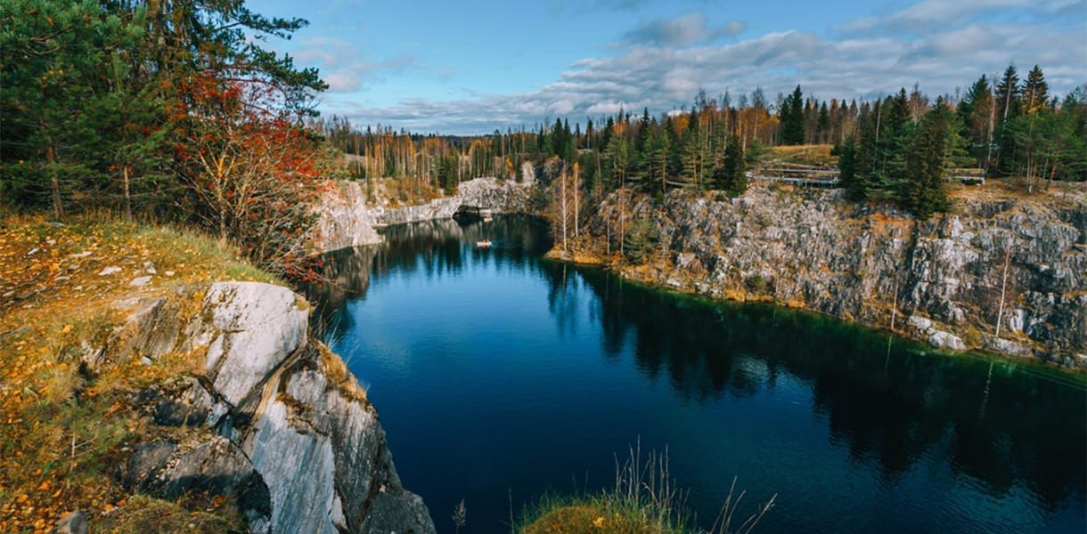Горный парк «Рускеала». Экскурсия и свободное время в Горном парке, поражающем своей красотой в любое время года. Его визитная карточка - Мраморный каньон. Это большое вытянутое с юга на север озеро с кристально чистой водой и отвесными берегами из настоящего мрамора. Раньше здесь добывали этот декоративный камень для отделки архитектурных шедевров Санкт-Петербурга.