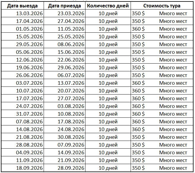 СТОИМОСТЬ ТУРА и ДАТЫ